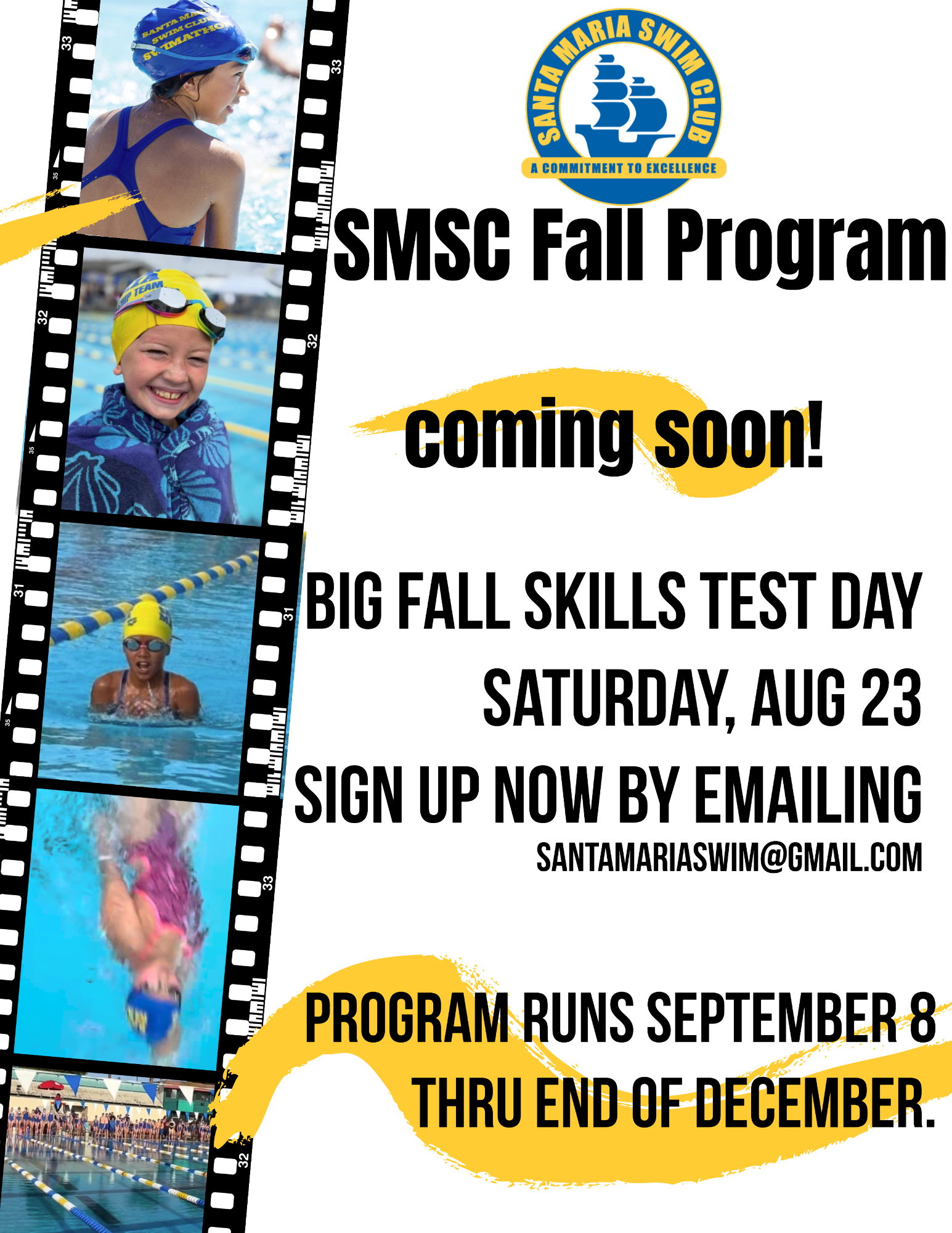 (Santa Maria, CA) - The SMSC BIG FALL SKILLS TEST DAY is Saturday, August 23! If you are CURRENTLY on the team - there is no need to re-test. But spread the word! SMSC is going big for our 100th Anniversary and you don't want to miss all the big things coming this year!